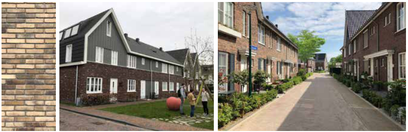 De woningen worden overwegend uitgevoerd in baksteen in verschillende lichte bruine aardse tinten. Verbijzonderingen in hout dragen bij aan het gevarieerde dorpse beeld en aan de gewenste dorpse schaal in het gebied (gewenste verhouding bak- steen-hout circa 70%-30%). De bebouwing in de knik van de hoofdontsluiting vormt een bijzonder bebouwingsaccent, een special op de schaal van de buurt. Dit komt tot uitdrukking in een deels grotere bouwhoogte maar moet ook in architectuur, materialisatie, kleurstelling, etc. herkenbaar zijn.