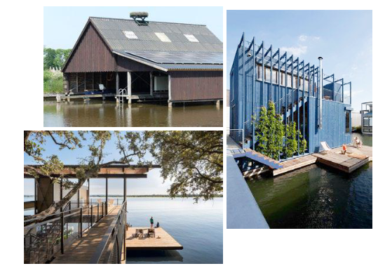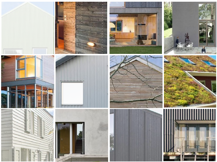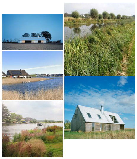 Inspiratie / referenties voor de vormgeving: Eenvoudige, enkelvoudige en eigentijdse volumes, meestal lage goothoogte, aandacht voor aansluiting met het water, natuurlijk en licht(gewicht) kleurmateriaalpalet.