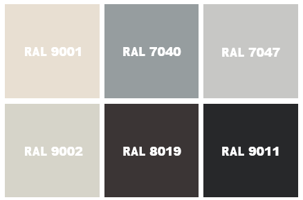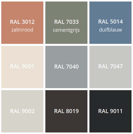 RAL kleuren dienen als indicatie van maximale kleurfelheid, vergrijsde/fletsere versie van bovenstaande kleuren kunnen worden toegepast.