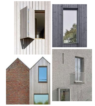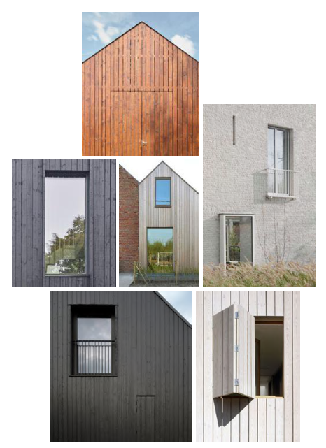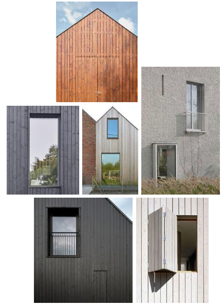 Gevelafwerking zoals hout, plaatmateriaal of cementeer/keimwerk kunnen naturel, onafgewerkt of (transparant) gebeitst worden toegepast. Indien voorzien van kleur en/of kleurenpalet.