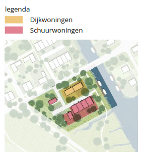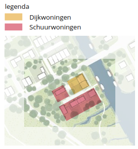 De dijkwoningen krijgen een herkenbaar, maar afgebakend kleur- en materiaalpalet met ruimte voor variatie en eigen invulling. Daarmee ontstaat onderscheid ten opzichte van de schuurwoningen en wordt het mogelijk om de rijzige voorgevels kracht bij te zetten, terwijl de samenhang binnen de dijkwoningen in grote lijnen zichtbaar is.