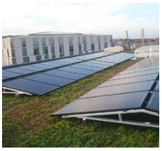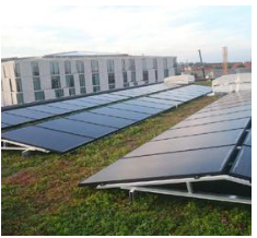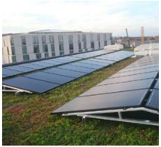 PV-panelen onder een hoek richting de zon op platte (groene) daken