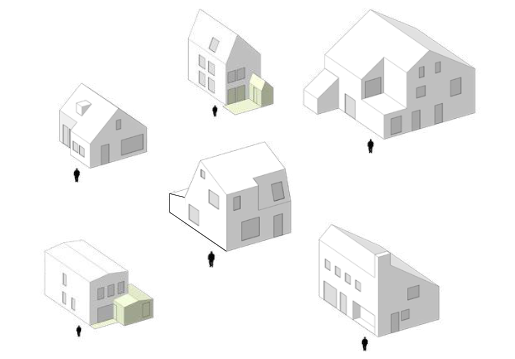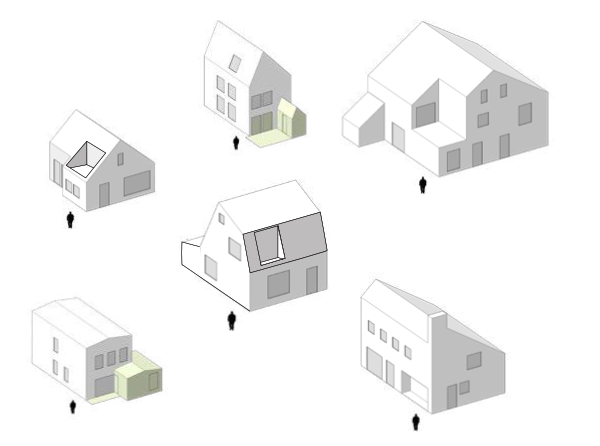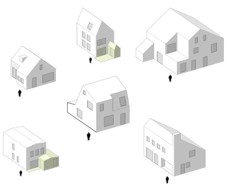 NB. Deze voorbeelden zijn slechts bedoeld als typologische duiding van aanbouwen ed. en niet als kleur of materiaalreferentie en niet als duiding voor de hoofdvorm.