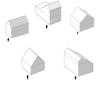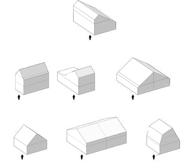 Voorbeelden van mogelijke vormen van het hoofdgebouw. Verschillende kaphellingen en asymmetrische kappen zijn mogelijk. De doorsnede is continu. Lage goothoogte, meestal 1 laag plus kap.