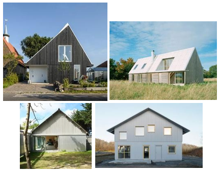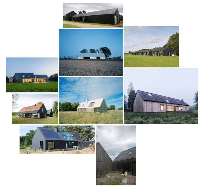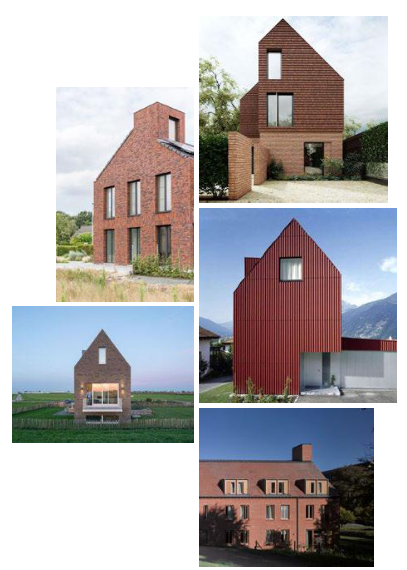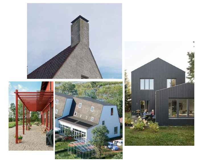 Voorbeelden van woningen met eenduidige hoofdvorm en bijgebouwen/aanbouwen zijn onderdeel van de architectuur, luifels en overstekken zijn onderdeel van de architectuur van de hoofdmassa, ze zijn rank, ingetogen en staan in samenhang met het gebruik en het programma NB. Deze beelden zijn bedoeld als aanvullende duiding van de gebouwvorm, niet als kleurmateriaalpalet.