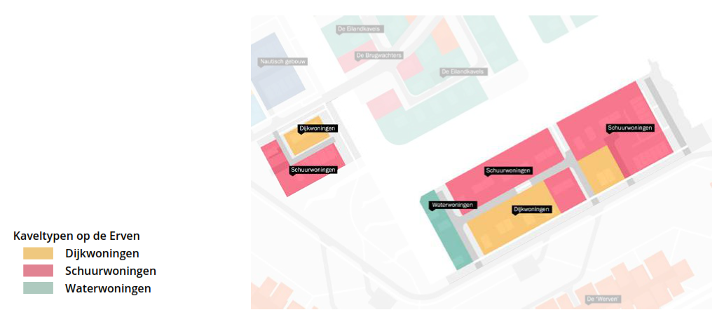 Ook in De Erven worden hoofdhuizen, ofwel ‘dijkwoningen’ gerealiseerd aan de weg. Dit zijn zowel vrijstaande als twee-onder-een- kap woningen. Vaak met een royale, open en lommerrijke voor en/of zijtuin. Ernaast en erachter komen schuurwoningen. Dit zijn vrijstaande, twee-onder-een-kap, en geschakelde woningen. Deze worden ontsloten via een (woon-)erf in een eenvoudige/abstracte, I-, L- of T-vorm. Via deze erven vindt ook de auto-ontsluiting plaats voor alle woningen. Overwegend wordt door bewoners op de eigen kavel geparkeerd. Parkeren voor de rijwoningen en voor bezoekersparkeren wordt voorzien in compacte, meestal haakse parkeerkoffers in deze erven. De erven zijn het domein voor fietsers en voetgangers; auto’s zijn ‘te gast’. Vanaf ieder erf kan men uitkijken op het water. Bijna ieder erf heeft ook de mogelijkheid een openbare of collectieve aanleg-voorziening voor boten te realiseren. Kavels direct aan het water gelegen krijgen een eigen aanlegvoorziening voor boten.