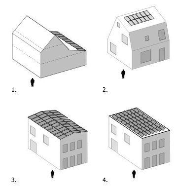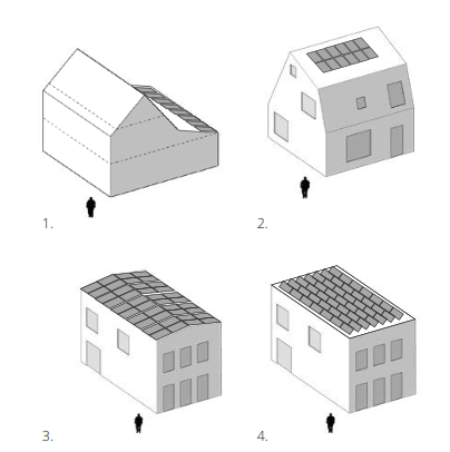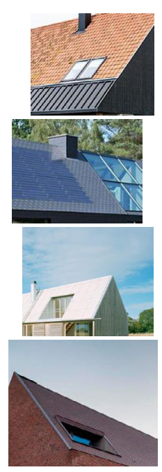 Daken zijn in basis donker, zodat PV-panelen wegvallen in dakvlakken. Alternatief kan er gewerkt worden met dakvlakken die in ton-sur-ton kleurverhouding staan ten opzichte van het gevelmateriaal. In dat geval worden de PV-panelen zo geplaatst dat ze nauwelijks zichtbaar zijn vanuit de openbare ruimte.