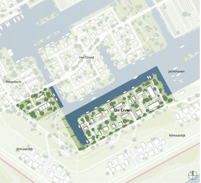 Het Dorpserf ligt tegen de dorpskern aan, in de hoek die de weg naar het eiland met de klimaatdijk maakt. Hier komen drie verschillende woonsferen samen; namelijk de dorpskern, het groene landschap van de klimaatdijk én de waterwereld van de eilanden en erven. Het Dorpserf heeft daarmee een bijzonder afwisselende omgeving en wordt een herkenbaar punt.