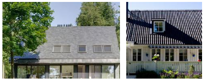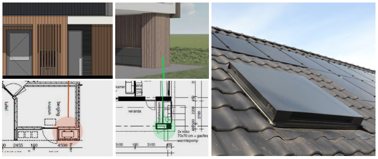 In deze voorbeelden zijn de dakkapellen en schoorstenen totaal ondergeschikt aan de hoofdbouwmassa. In dit geval wordt de dakkapel uitgevoerd in de kleur van het dak (zwart/antraciet) en met minimale bouwdetails, dus zonder overstekken en schaduwranden.