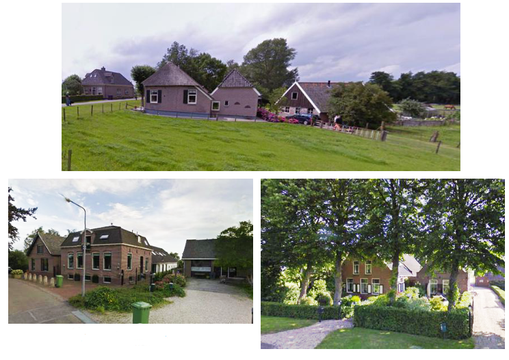 Sfeerimpressie van de openbare ruimte op de erven, gebouwensembles en buurtjes bestaande uit een uitgesprokener hoofdhuis aan de dijk met ingetogen schuren op de achtergrond.