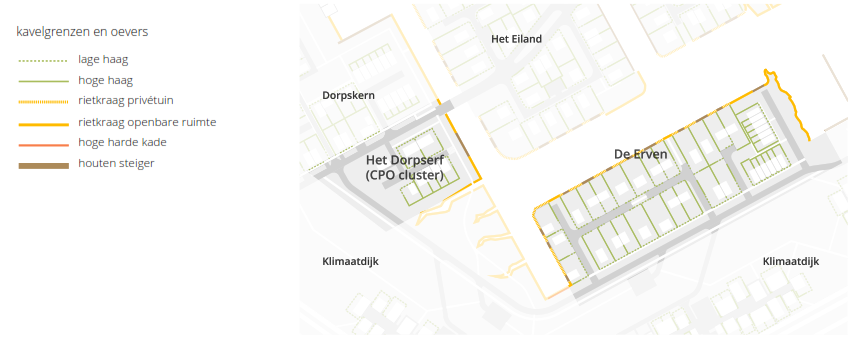 Aan deze ontsluitingsweg vanaf Het Eiland, wordt feitelijk ook een erf ontsloten. Dit erf wordt mogelijk als CPO project ontwikkeld. Het onderscheidt zich door zijn wat hogere ligging t.o.v. het aangrenzende landschap onder aan de dijk. De hagen van de kavels naar het aangrenzende openbare gebied worden laag gehouden, zodat daarmee een open relatie met het landschap kan worden gemaakt, zonder dat de privacy van de bewoners in het geding komt.