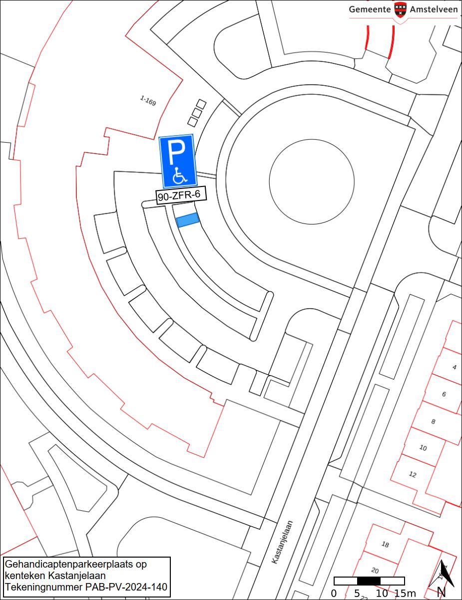 Burgemeester en wethouders van Amstelveen besluiten het parkeren te verbieden op een parkeerplaats in de Kastanjelaan, zoals aangegeven op tekening PAB-PV-2024-140, met uitzondering van het voertuig met het kenteken 90-ZFR-6 (gehandicaptenparkeerplaats).