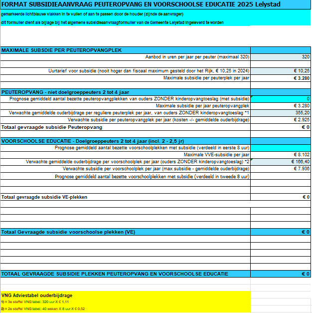 Aanvrager: een instelling die reguliere dagdelen peuteropvang en/of VVE peuterplaatsen aanbiedt en gevestigd is in de gemeente Lelystad en geregistreerd in het Landelijk Register Kinderopvang; een bestuur van scholen, met scholen gevestigd in Lelystad, met onderwijsachterstanden of instellingen die voldoen aan Wet Stelsel Openbare Bibliotheekvoorzieningen en gevestigd zijn in Lelystad.