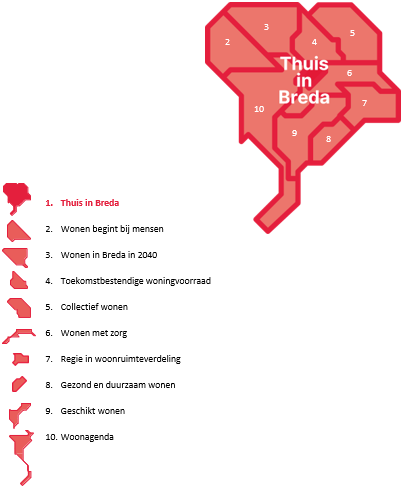 Je thuis voelen in Breda, daar staan we voor. Of je nu al in Breda woont, wilt ver- huizen binnen onze gemeente of hier wilt komen wonen. Maar wat maakt een huis een thuis? Dit is persoonlijk en daarmee voor iedereen anders. Wat voor iedereen geldt, is dat de buurtbewoners, woning en woonomgeving grotendeels bepalen of je je ergens thuis voelt. Wonen gaat uiteraard over woningen, maar ook over mensen en de omgeving waarin je woont.