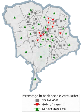 Op wijkniveau bestaan er grote verschillen in Breda. In een aantal buurten is de woningvoorraad eenzijdig. Hierbij zie je een oververtegenwoordiging van sociale huurwoningen of eengezinswoningen. De Leefbaarometer toont verschillen tussen buurten. In buurten waar relatief veel sociale huurwoningen zijn, leidt dit vaak tot concentratie van inwoners in een kwetsbare situatie. Dit kan leefbaarheids- problemen veroorzaken. Dit creëert een tweedeling in Breda, zoals te zien in bijgaande figuur. Als partner van Verbeter Breda dragen we met ons woonbeleid bij aan het verbeteren van de kansengelijkheid.