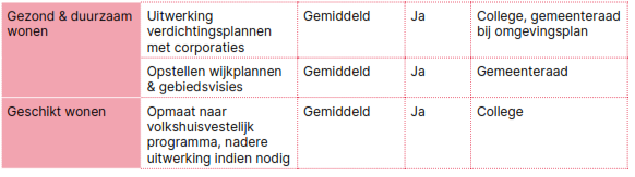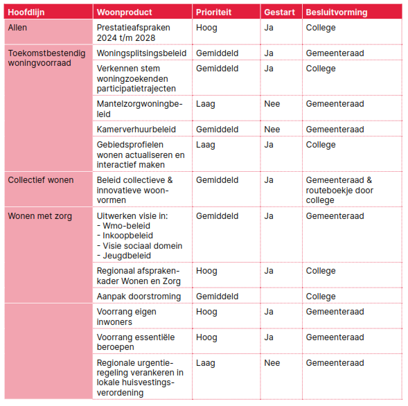 Hieronder staat hoe we verder uitvoering geven aan ons woonbeleid en daarbij belangrijkste partnerschappen. Doen staat hierbij centraal en vaak is dat een beleidsproduct. Over de voortgang rapporteren we via de P&C-cyclus.