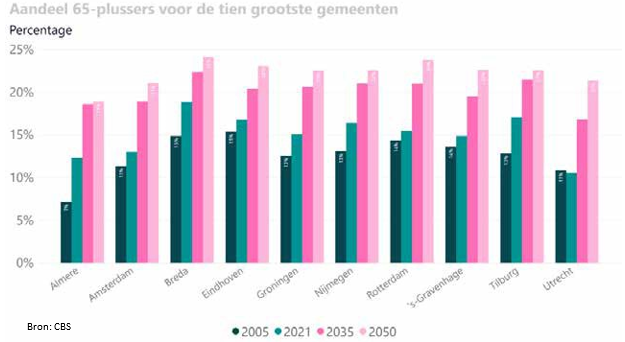 De grootste groei is te zien bij het aantal senioren. Net als hun aandeel binnen de totale bevolking. Ook worden senioren gemiddeld ouder. De bevolking in Breda vergrijst sterker dan in de andere grootste gemeenten, maar minder hard dan in de regiogemeenten. Deze (toekomstige) senioren wonen grotendeels al hier. Het verder vergrijzen van de bevolking gaat met de jaren vanzelf.