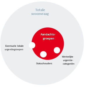 Zo zijn er aandachtsgroepen, met een specifieke woonwens. Dit zijn studenten, senioren, woonwagenbewoners en arbeidsmigranten. Een deel van de senioren heeft ook een zorg- of ondersteuningsbehoefte. Ook zijn statushouders een aandachtsgroep. De taakstelling hiervoor wordt wettelijk bepaald. Wettelijke urgentiegroepen zijn mantelzorgers en -ontvangers, medisch en sociaal urgenten, bewoners die uitstromen uit de maatschappelijke opvang of beschermd wonen, klinische GGZ, vrouwenopvang en slachtoffers mensenhandel, accommodatie jeugdhulp, (jeugd)detentie, forensische zorg en uitstappende sekswerkers.