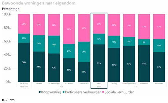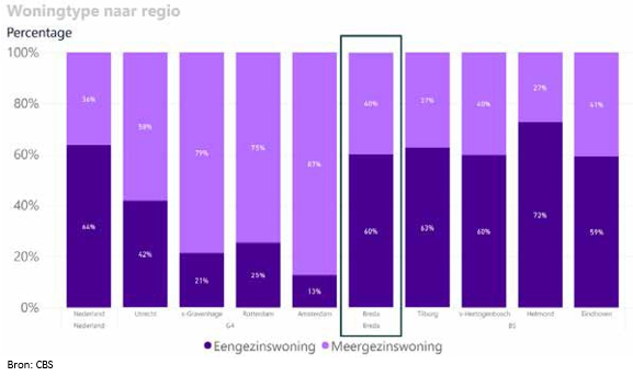 In de figuur hieronder is de samenstelling van de woningvoorraad naar type weergegeven, voor heel Nederland, de vier grootste steden van het land (G4) én de vijf grootste steden in Brabant (B5), waaronder Breda.