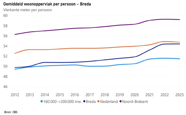 Het gemiddelde woonoppervlak per bewoner in Breda is toegenomen van 49,8 m2 in 2012 tot 54,4 m2 in 2023. Deze ontwikkeling is ook landelijk te zien. Dit is het gevolg van het afnemen van het gemiddeld aantal bewoners per woning en de bouw van grotere gezinswoningen na 2000. Overigens worden er de laatste jaren juist weer kleinere woningen gebouwd.