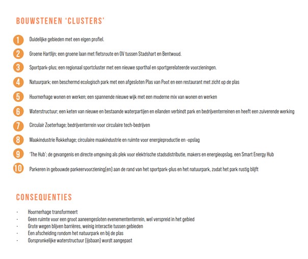 33 | Functies die niet in het toekomstbestendige profiel van de terreinen passen dienen geweerd te worden. | Omgevingsprogramma: aanscherping om welke functies het gaat. Nieuwe profielen op hoofdlijnen: Rokkehage: gemengd bedrijvigheid met ruimte voor broedplaats, stadslogistiek en bedrijvigheid in aansluiting op het Dutch Innovation Park Hoornerhage: gemengd werken - wonen Zoeterhage: gemengde bedrijvigheid met focus op circulaire economie | Deels (aanscherping die binnen kaders past) |