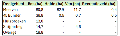 Het Meerven betreft een uitgestrekt heideterrein met drie grote en diverse kleinere vennen, omringd door bos. 45 Bunder is voor een deel natuurlijk bos met inlandse eik en grove den en voor een deel uit douglassparren. De Hulsbroeken is een typische heideontginning die na 1900 is ingeplant met voornamelijk grove dennen. Strijperheg is een elzenbroekbos met zwarte els, zachte berk en zomereik in de boomlaag. Het gebied bevat ook open en natte delen, die bestaan uit struweel van grauwe wilg en gagel, rietvelden en open water.