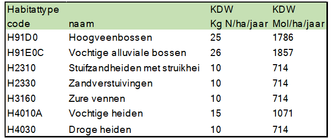 Tabel 2 De kritische depositie waarde per habitattypen.