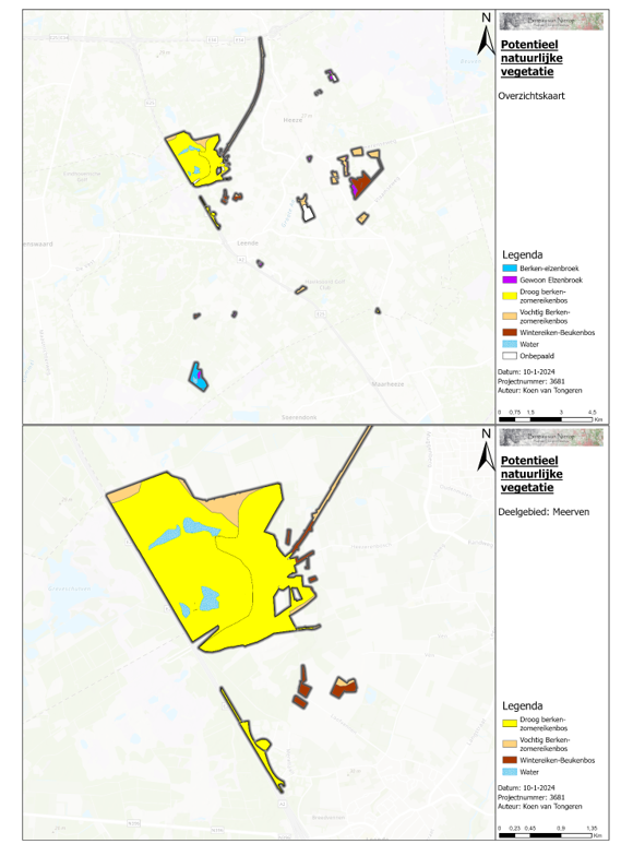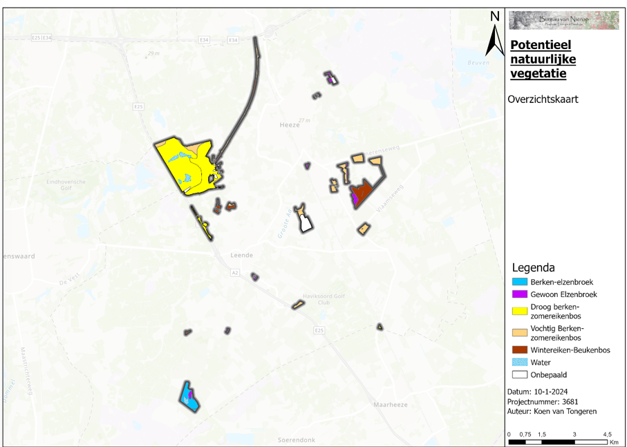 De Potentieel Natuurlijke Vegetatie (PNV) geeft de samenstelling van de vegetatie weer bij een ongestoorde spontane ontwikkeling gedurende enkele honderden jaren. Deze is afhankelijk van de groeiplaats en concurrentiekracht van boomsoorten op die groeiplaats. Hierbij wordt uitgegaan van de afwezigheid van uitheemse boomsoorten. De PNV van de bosgebieden van de gemeente Heeze - Leende is bepaald aan de hand van bodem en grondwaterstand. In het plangebied zijn op basis van bovengenoemde parameters de volgende PNV’s onderscheiden: Droog Berken - zomereikenbos, Vochtig Berken - Zomereikenbos, Wintereiken - beukenbos, Berken - Elzenbroekbos en gewoon Elzenbroekbos. Op de kaart van figuur 11 zijn de verschillende PNV’s weergegeven. Het Droog Berken-zomereiken bos is het meest voorkomend.
