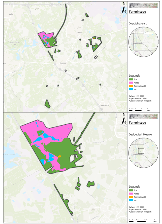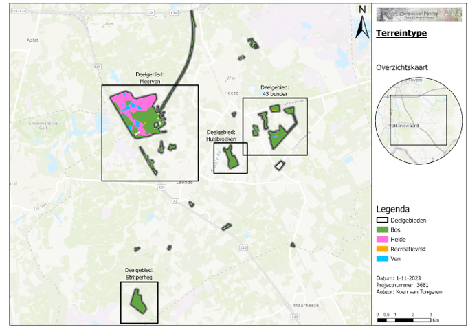 De gemeentelijke eigendommen liggen verspreid binnen de gemeente en zijn binnen deze rapportage gegroepeerd per deelgebied (figuur 1). Het grootste deelgebied wordt het ‘Meerven’ genoemd. Het gebied betreft een uitgestrekte heide met drie grote en diverse kleinere vennen. Het bos hieromheen bestaat uit vastgelegde stuifzanden met veel reliëf en oude vliegdennen. Twee andere deelgebieden zijn ‘45 Bunder’ en ‘Hulsbroeken’. Deelgebied 45 Bunder bestaat uit een tweede generatie bos, waarin soorten voorkomen met een hoge productiewaarde als douglas en fijnspar. Deelgebied Hulsbroeken is een typische heideontginning bestaande uit grove dennenbossen. Daarnaast ligt er ten westen van Leenderstrijp het deelgebied ‘Strijperheg’ een elzenbroekbos met een sterk natuurlijk karakter.