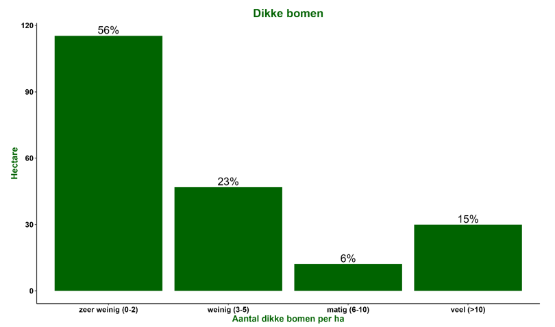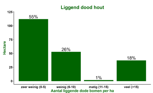 Het aantal dode bomen is sterk toegenomen. Op elke hectare zijn meer dan 15 staande en 15 liggende dode bomen aanwezig. Ook zijn er meer dan 15 dikke bomen per hectare. In het bos hebben natuurlijke processen de overhand en de biodiversiteit is hoog. Windworp en natuurlijke sterfte zorgen voor gaten in het kronendak waardoor spontane verjonging ontstaat. Er zijn bomen van alle leeftijdsfasen aanwezig. Ook is er een goed ontwikkelde struiklaag. Hierdoor is er veel verticale structuur aanwezig. Exoten zoals Amerikaanse vogelkers en Amerikaanse eik ondervinden veel concurrentie van inheemse loofboomsoorten. De exoten komen slechts sporadisch voor.