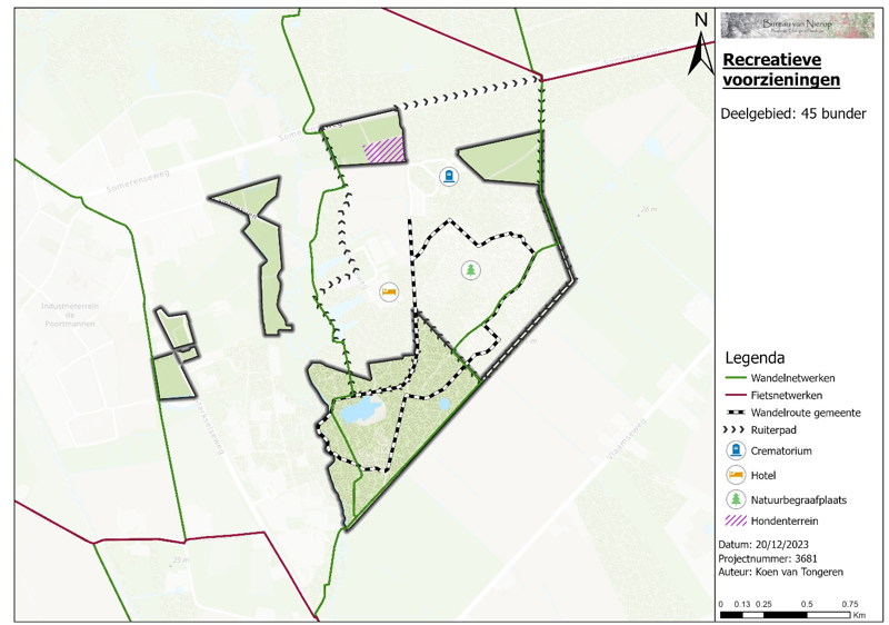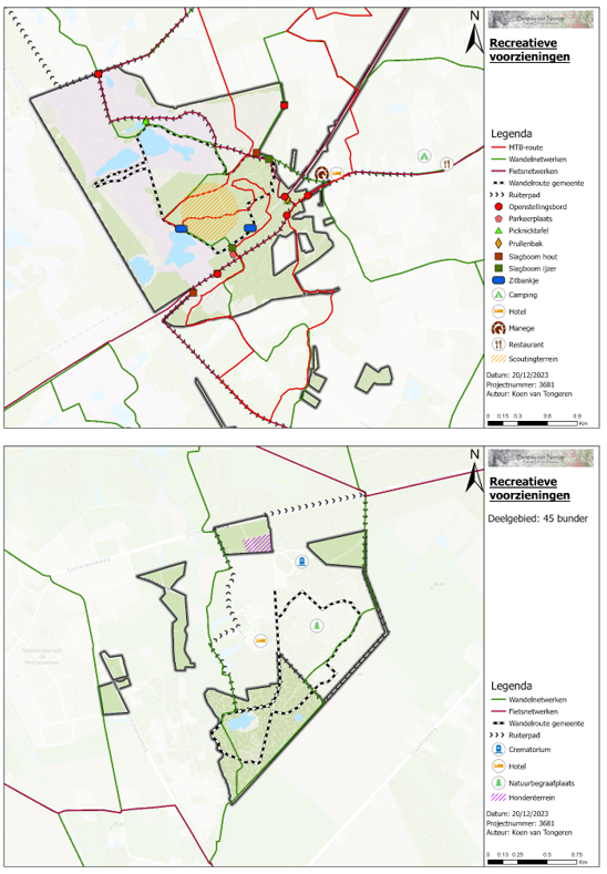 In deelgebied 45 Bunder is een gemeentelijke wandelroute aanwezig. Er zijn verder geen recreatieve voorzieningen. Als aanvulling op de bestaande wandelroute is het plaatsen van een bankje of picknick tafel gewenst. In overige gebieden zijn geen recreatieve voorzieningen aanwezig die onderhouden moeten worden. Hier zijn ook geen recreatieve voorzieningen gewenst.