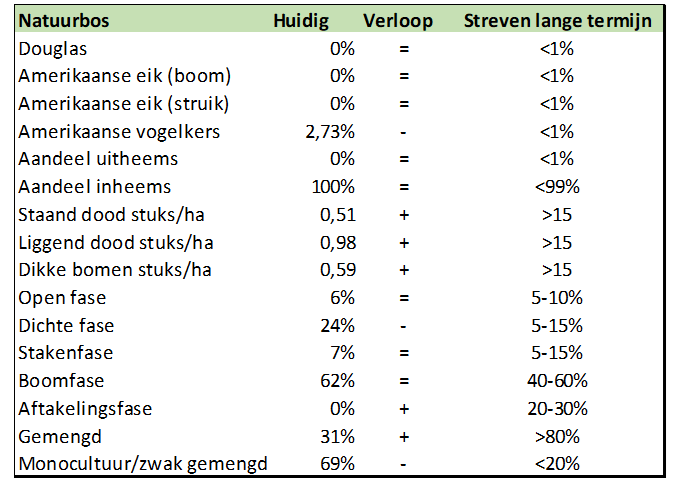 Tabel met de huidige kenmerken en met de na te streven kenmerken binnen de natuurbossen