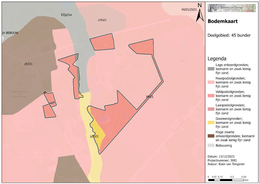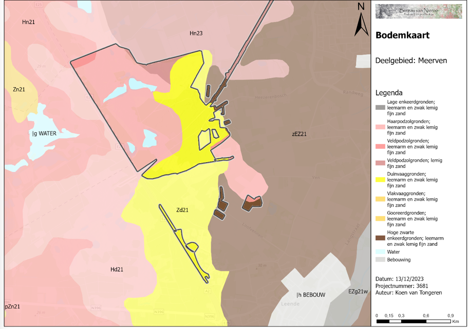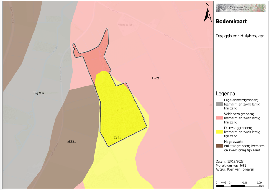 De bossen van de deelgebieden Meerven, 45 bunders en Hulsbroeken zijn aangelegd op gronden die voorheen bestonden uit heidegebieden. Bodemkundig worden deze gronden gerekend tot de haar- en veldpodzolgronden en tot de duinvaaggronden (zie figuur 6). De duinvaaggronden zijn aanwezig in de reliëfrijke zandverstuivingen terwijl in de vlakke gebieden de haar- en veldpodzolgronden aanwezig zijn. Het kenmerkende aan deze twee bodemtypes is dat ze beiden zijn gevormd onder heidevegetatie. Haarpodzolgronden zijn ontstaan op hoger gelegen heidegebieden waar de waterstand laag is. Veldpodzolgronden ontwikkelden zich echter in lagergelegen heidegebieden met een periodiek of permanent hoge grondwaterstand en ze zijn kenmerkend voor jonge heideontginningen.