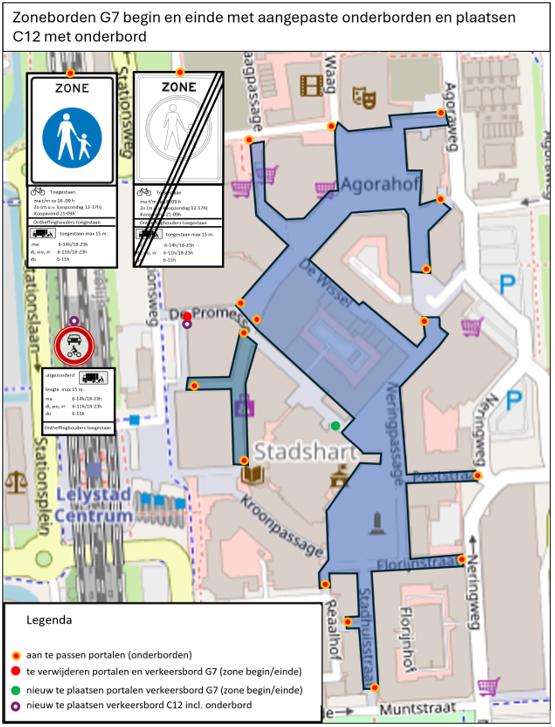 het noodzakelijk is dat de voetgangerszone een sluitend cordon blijft en het daarom noodzakelijk is verkeersborden G7 zone begin/einde te plaatsen, inclusief onderborden met de tekst: fietsers toegestaan ma t/m za 18-09h, zo (m.u.v. koopzondag 12-17h, koopavond 21-09h) op: