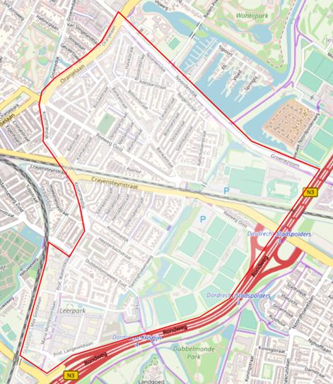 Het gebied binnen de wijk Reeland dat wordt begrensd door de straten: Noordendijk, Rondweg, Laan der Verenigde Naties, Max Gootelaan, Prof Waterinklaan, Eemsteynstraat, Eemsteynplein, Krommedijk, Oranjelaan, de genoemde wegen, oevers en aanwezige knooppunten van het openbaar vervoer daarbij inbegrepen.