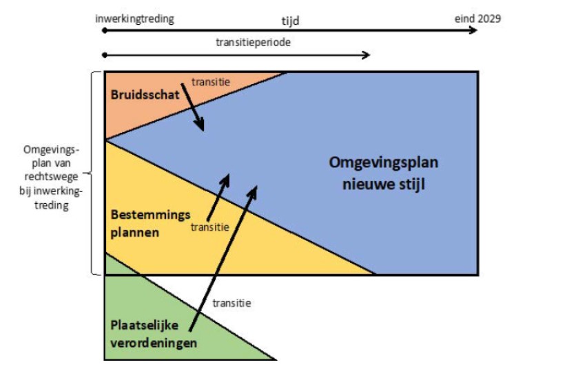 Wanneer de Omgevingswet in werking wordt gesteld, zijn er de eerstkomende jaren (tot uiterlijk eind 2029) mogelijkheden in de Omgevingswet ingebouwd om gebruik te maken van Overgangsrecht. Op hoofdlijnen is dit schematisch weergegeven in afbeelding 1.1.