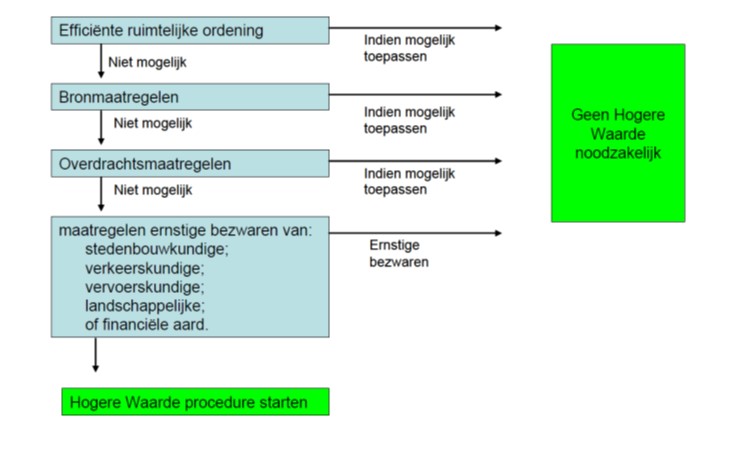 En indien na afweging de geluidbelasting hoger is dan de voorkeursgrenswaarde dient (door de gemeente) een hogere waarde te worden vastgesteld, uitgaande van de geluidproductie van de rijksinfrastructuur bij volledige benutting van de geluidproductieplafonds die voor de rijkswegen wettelijk gelden.