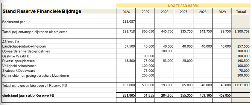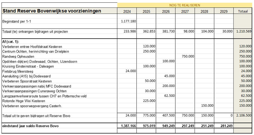 Vaststelling van deze nota houdt impliciet in dat de gemeente werk maakt van de realisatie van deze ambities. De bijdragen die worden opgehaald worden gestort in de (bestemmings)reserves bovenwijkse voorzieningen en ruimtelijke ontwikkelingen/ financiële bijdrage. Echter, deze reserves dekken slechts een deel van de opgenomen investeringen. Voor de voorziene investeringen moet dus aanvullende dekking worden gevonden. Het is namelijk logisch dat de bestaande omgeving ook mee betaalt aan nieuwe voorzieningen. Dat kan op allerlei manieren, zoals de reguliere investeringskredieten, budgetten, of aanwending van een reserve.