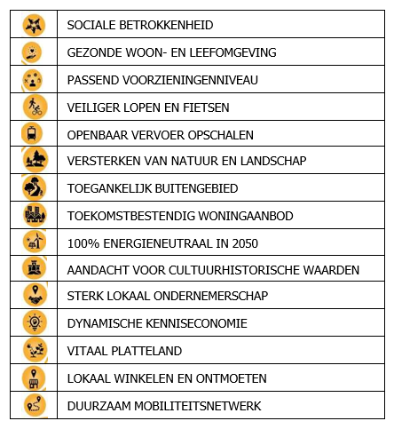 In onze omgevingsvisie hebben we twaalf onderwerpen vastgesteld waarop we in gebiedsontwikkeling vooruitgang willen boeken. Hieronder zijn de maatschappelijke thema's opgesomd, in lijn met de onderwerpen en thema's in de omgevingsvisie: