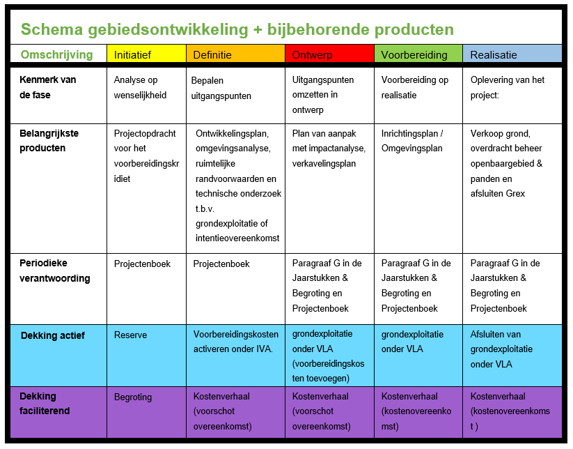 Het proces van gebiedsontwikkeling, zoals beschreven in het projectenboek is verdeeld in vijf afzonderlijke fases.