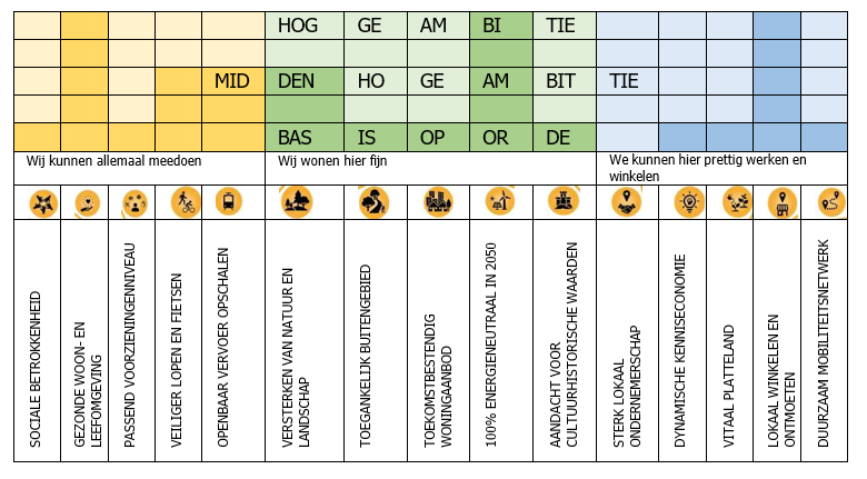 Voorbeeld van een waardenmatrix. De waardenmatrix geeft weer welke specifieke maatschappelijk opgaves en ambities we in het bijzonder nastreven op de betreffende locatie en welk ambitieniveau we hebben.
