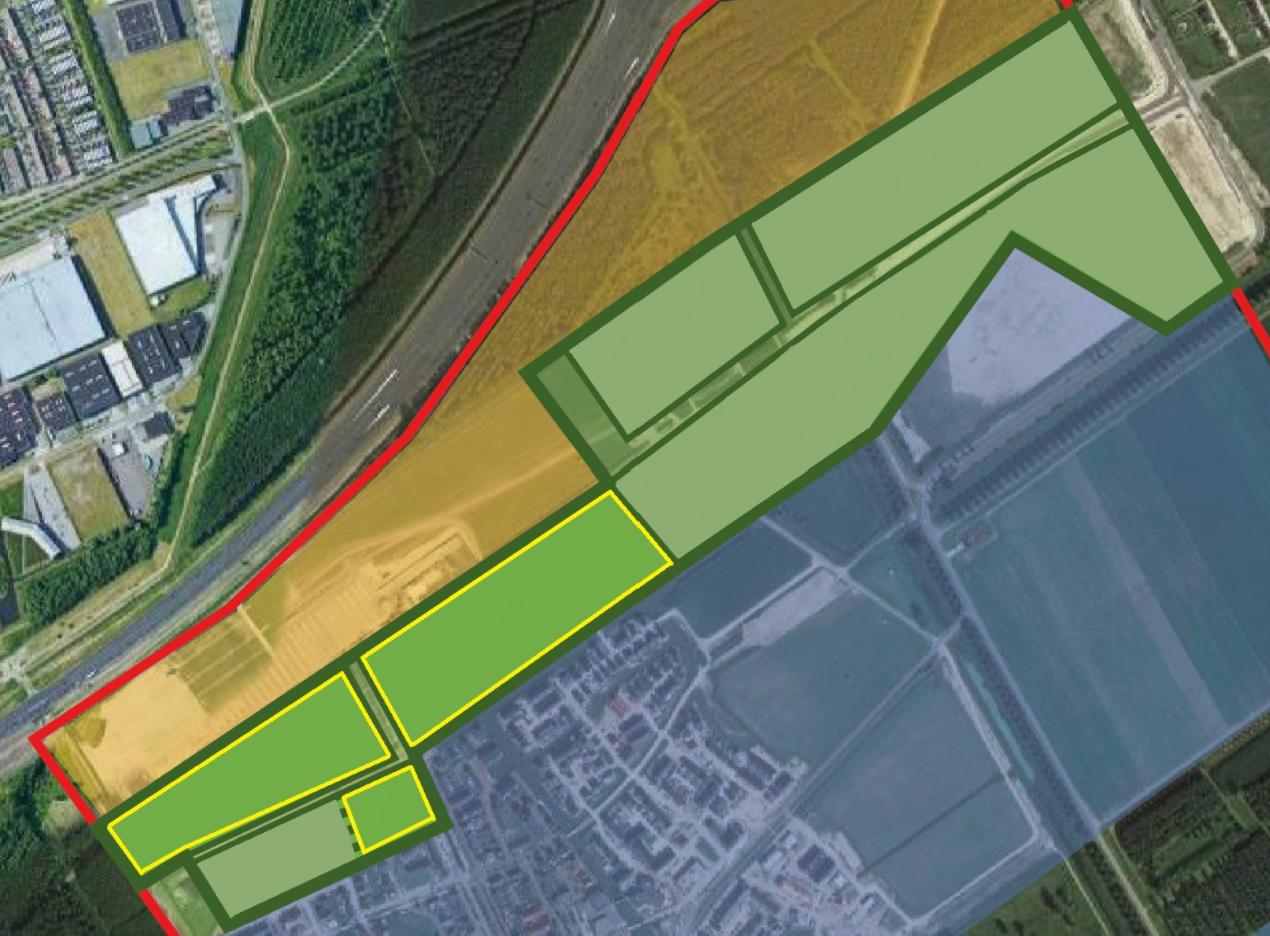De wijziging van het Omgevingsplan heeft betrekking op het zuidwestelijk deel van Fase 5 (in geel omlijnd in onderstaande afbeelding). Het oostelijk deel van Fase 5 evenals het westelijk perceel zal op een later moment andere gebruiksdoelen krijgen conform de uitgangspunten uit het door de raad vastgestelde tweede addendum.