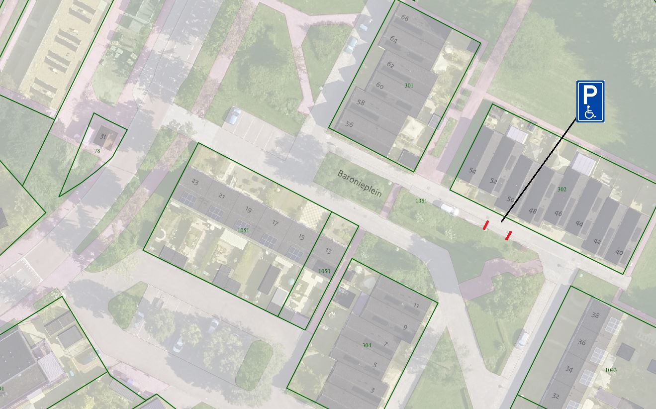 dat de gevraagde gehandicaptenparkeerplaats ingesteld kan worden als aangegeven op bijgaande tekening, direct voor de woning aan de andere zijde van de straat, door bord E6 van bijlage I behorende bij het “Reglement Verkeersregels en Verkeerstekens 1990” met onderbord te plaatsen waarbij het parkeren wordt verboden, met dien verstande dat het verbod niet geldt voor het motorvoertuig waarmee de aanvrager, zich pleegt te vervoeren dan wel waarmee hij vervoerd wordt;