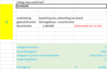 Omdat het bij sommige overtredingen vanwege de diversiteit in omvang, volumes en hoogtes lastig is om één dwangsom te bepalen en om daarbij zo objectief mogelijk te blijven, is er voor gekozen om de hoogte van de dwangsom mede vast te stellen aan de hand van onder meer oppervlaktematen (m²) of aan de hand van kuubs (m³), de ruimtelijke impact, veiligheidsrisico’s en gezondheidsrisico’s.