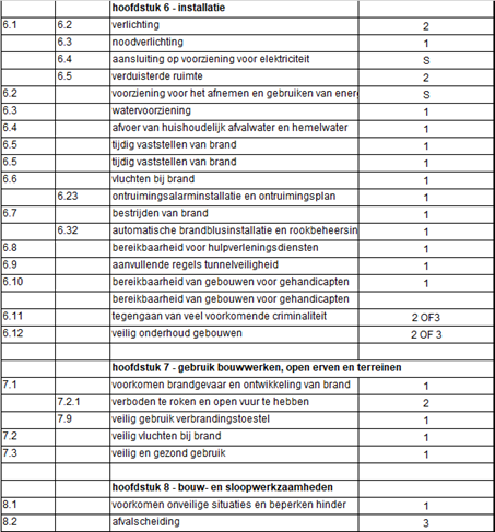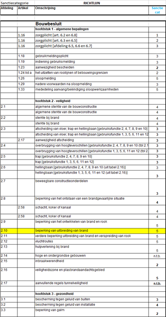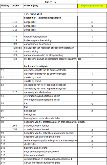 De onderstaande richtlijnen gaan niet zozeer uit van categorieën van overtredingen (zoals de bovenstaande tabel, maar bieden op artikelniveau van het Bouwbesluit/Besluit bouwwerken leefomgeving aanknopingspunten met: