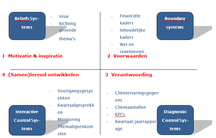 Binnen deze rolverdeling stellen we samen leren door samen werken centraal. Dit moet leiden tot inhoudelijke en financiële grip op het sociaal domein. Het model van Simons bestaat uit 4 kwadranten. Elk deel geeft richting aan hoe professionals te werk gaan. De 4 kwadranten moeten als totaal in evenwicht zijn om goede sturing te geven.