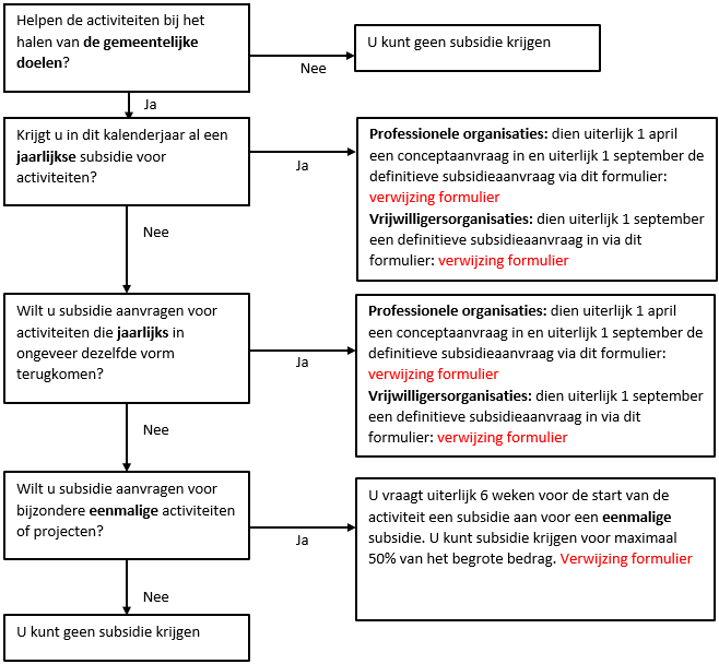 Het subsidiebeleid gaat ervan uit dat alleen activiteiten, die meewerken aan het halen van beleidsdoelen, subsidiabel zijn. Organisaties zijn op zichzelf niet subsidiabel, ook al begrijpen we dat er zonder organisaties geen activiteiten kunnen bestaan.