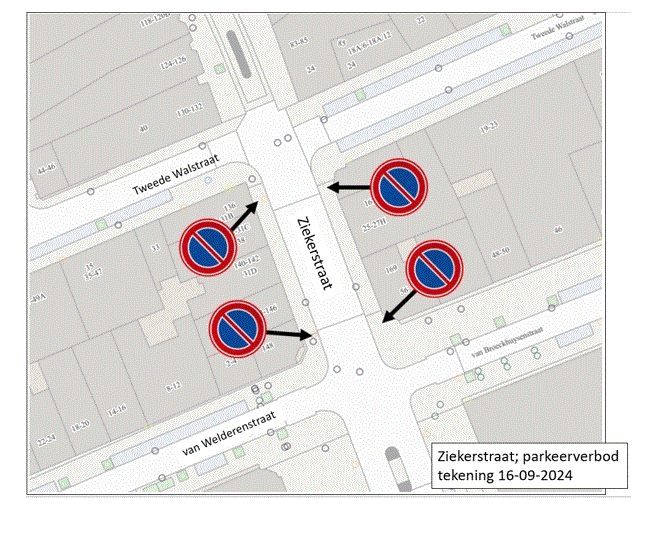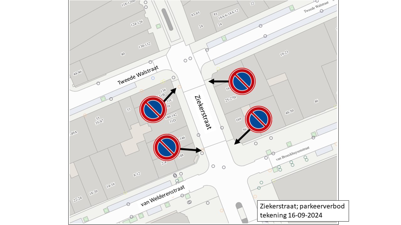 dat verbetering in deze situatie wordt gebracht door aan beide zijden van de Ziekerstraat tussen de Tweede Walstraat en de van Welderenstraat een parkeerverbod in te stellen;
