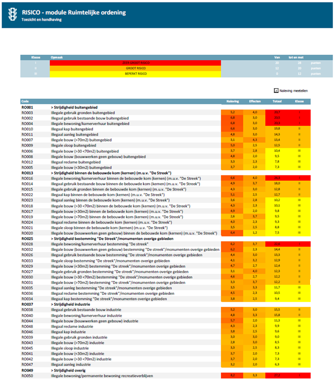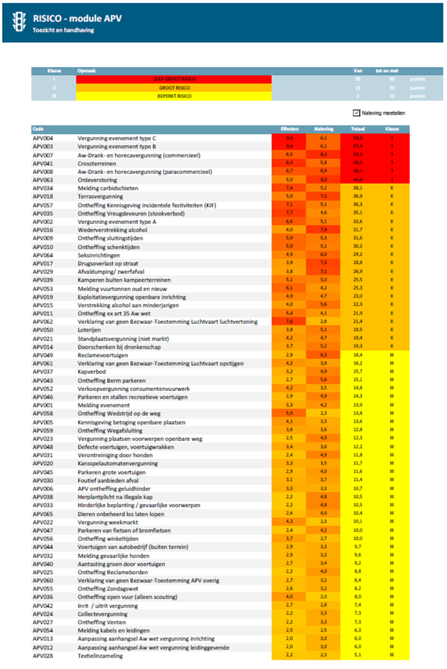 In de analyse is van alle activiteiten de inschatting van het risico voor de aantasting van de leefomgeving centraal gesteld. Het risico is daarbij de kans dat niet-naleving van voorschriften leidt tot ongewenste effecten en de schade die dit voor de leefomgeving oplevert. Hoe groter de kans op niet-naleving en hoe groter de schade voor de leefomgeving hoe meer de gemeente stuurt op naleving.