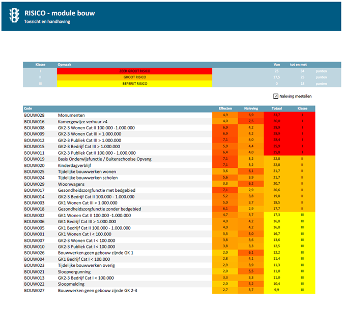 In de analyse is van alle activiteiten de kans geschat dat er iets kan gebeuren. Dit leidt vervolgens tot een onderverdeling in hoge, gemiddelde en lage prioriteiten. De hoogte van de prioriteit bepaalt de mate van intensiteit van het toezicht.